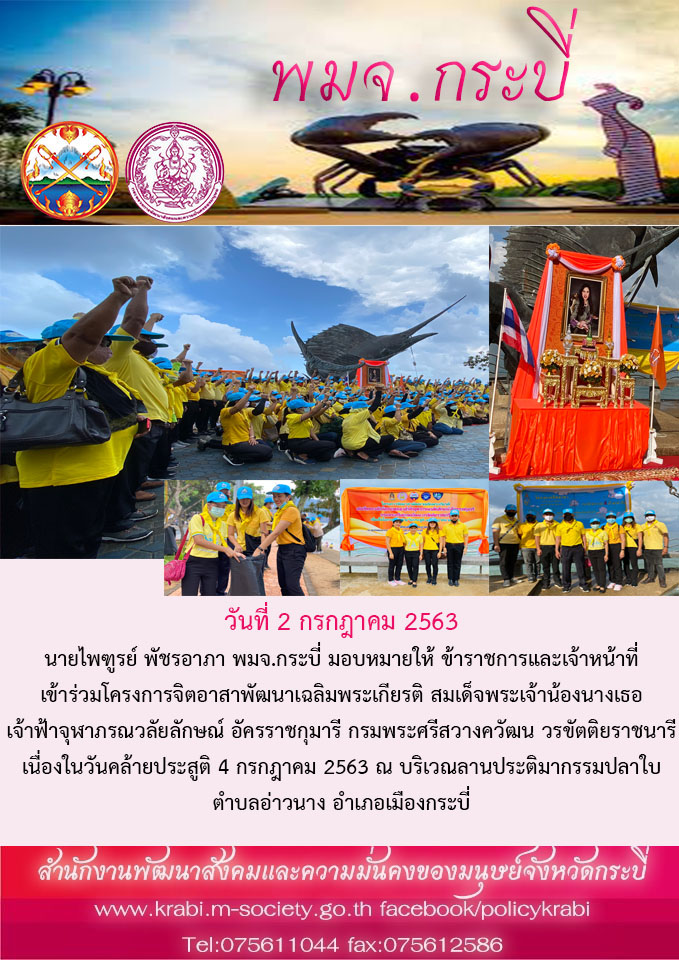 วันที่ 2 กรกฎาคม 2563 นายไพฑูรย์ พัชรอาภา พมจ.กระบี่ มอบหมายให้ ข้าราชการและเจ้าหน้าที่ เข้าร่วมโครงการจิตอาสาพัฒนาเฉลิมพระเกียรติ สมเด็จพระเจ้าน้องนางเธอ เจ้าฟ้าจุฬาภรณวลัยลักษณ์ อัครราชกุมารี กรมพระศรีสวางควัฒน วรขัตติยราชนารี เนื่องในวันคล้ายประสูติ 4 กรกฎาคม 2563 ณ บริเวณลานประติมากรรมปลาใบ ตำบลอ่าวนาง อำเภอเมืองกระบี่