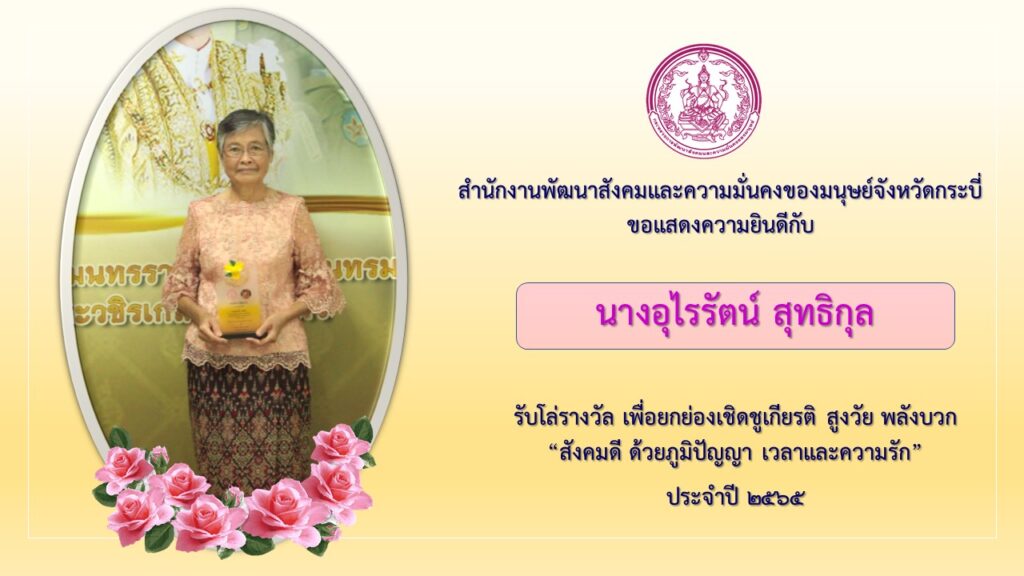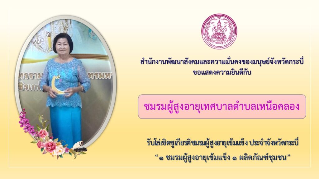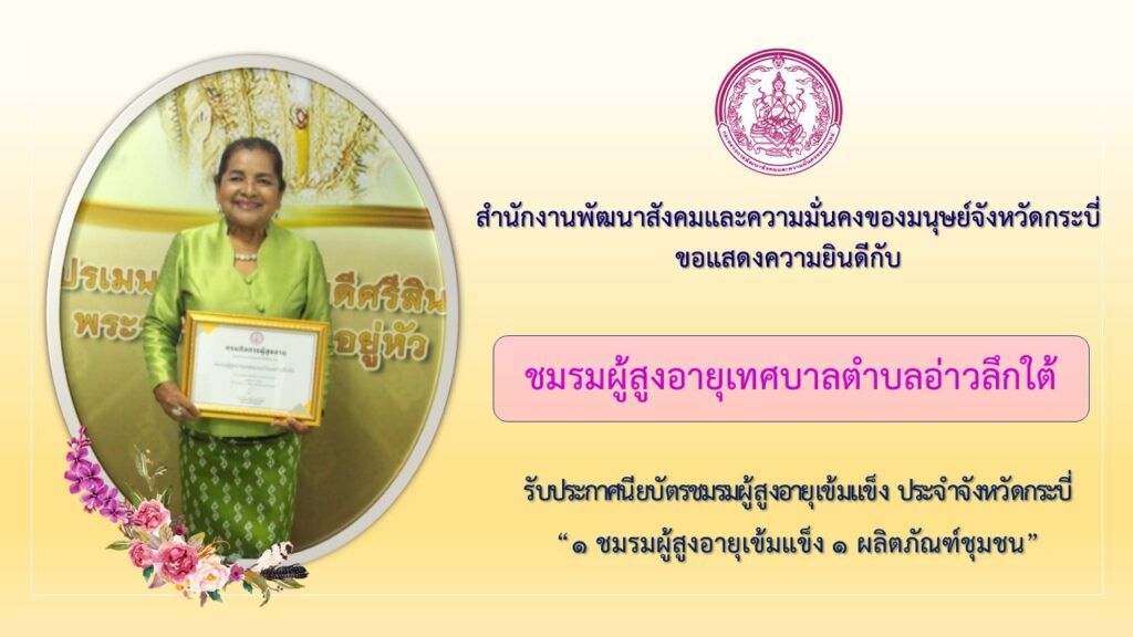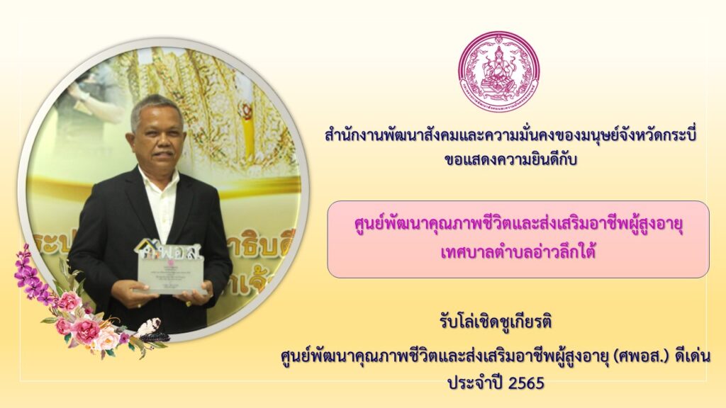 Posted on 26 ตุลาคม 2022 มอบโล่เชิดชูเกียรติแก่ผู้สูงอายุ ชมรมผู้สุงอายุ และศูนย์พัฒนาคุณภาพชีวิตและส่งเสริมอาชีพผู้สุงอายุ (ศพอส.) ประจำปี 2565 วันที่ 25 ตุลาคม 2565 เวลา 09.00 น.สำนักงานพัฒนาสังคมและความมั่นคงของมนุษย์จังหวัดกระบี่ มอบโล่เชิดชูเกียรติแก่ผู้สูงอายุ ชมรมผู้สุงอายุ และศูนย์พัฒนาคุณภาพชีวิตและส่งเสริมอาชีพผู้สุงอายุ (ศพอส.) ประจำปี 2565 โดยนายพุฒิพงศ์ ศิริมาตย์ ผู้ว่าราชการจังหวัดกระบี่ เป็นผู้มอบ ณ ห้องประชุมพนมเบญจา ชั้น 5 ศาลากลางจังหวัดกระบี่ 9/10 ดังนี้1. นายนิวัฒน์ วัฒนยมนาพร อายุ 67 ปี รับโล่เชิดชูเกียรติคลังปัญญาผู้สูงอายุดีเด่น ประจำจังหวัดกระบี่ ประจำปี 2565 สาขาภูมิปัญญา ด้านทรัพยากรธรรมชาติและสิ่งแวดล้อม 2. ศูนย์พัฒนาคุณภาพชีวิตและส่งเสริมอาชีพผู้สูงอายุเทศบาลตำบลอ่าวลึกใต้ อ.อ่าวลึก จ.กระบี่ รับโล่เชิดชูเกียรติศูนย์พัฒนาคุณภาพชีวิตและส่งเสริมอาชีพผู้สูงอายุดีเด่น ประจำปี 2565 ภายใต้การดำเนินงานของเทศบาลตำบลอ่าวลึกใต้3. ชมรมผู้สูงอายุเทศบาลตำบลเหนือคลอง อ.เหนือคลอง จ.กระบี่ รับโล่เชิดชูเกียรติชมรมผู้สูงอายุเข้มแข็งประจำจังหวัดกระบี่ “1 ชมรมผู้สูงอายุเข้มแข็ง 1 ผลิตภัณฑ์ชุมชน” 4. ชมรมผู้สูงอายุเทศบาลตำบลอ่าวลึกใต้ อ.อ่าวลึก จ.กระบี่ รับมอบประกาศนียบัตรชมรมผู้สูงอายุเข้มแข็งประจำจังหวัดกระบี่ “1 ชมรมผู้สูงอายุเข้มแข็ง 1 ผลิตภัณฑ์ชุมชน” ภายใต้การดำเนินงานของเทศบาลตำบลอ่าวลึกใต้ 5.นางอุไรรัตน์ สุทธิกุล อายุ 65 ปี รับโล่รางวัล เพื่อยกย่องเชิดชูเกียรติ สูงวัย พลังบวก“สังคมดี ด้วยภูมิปัญญา เวลาและความรัก” ประจำปี 2565 Share: